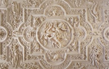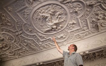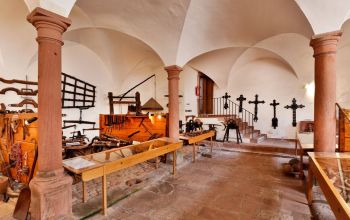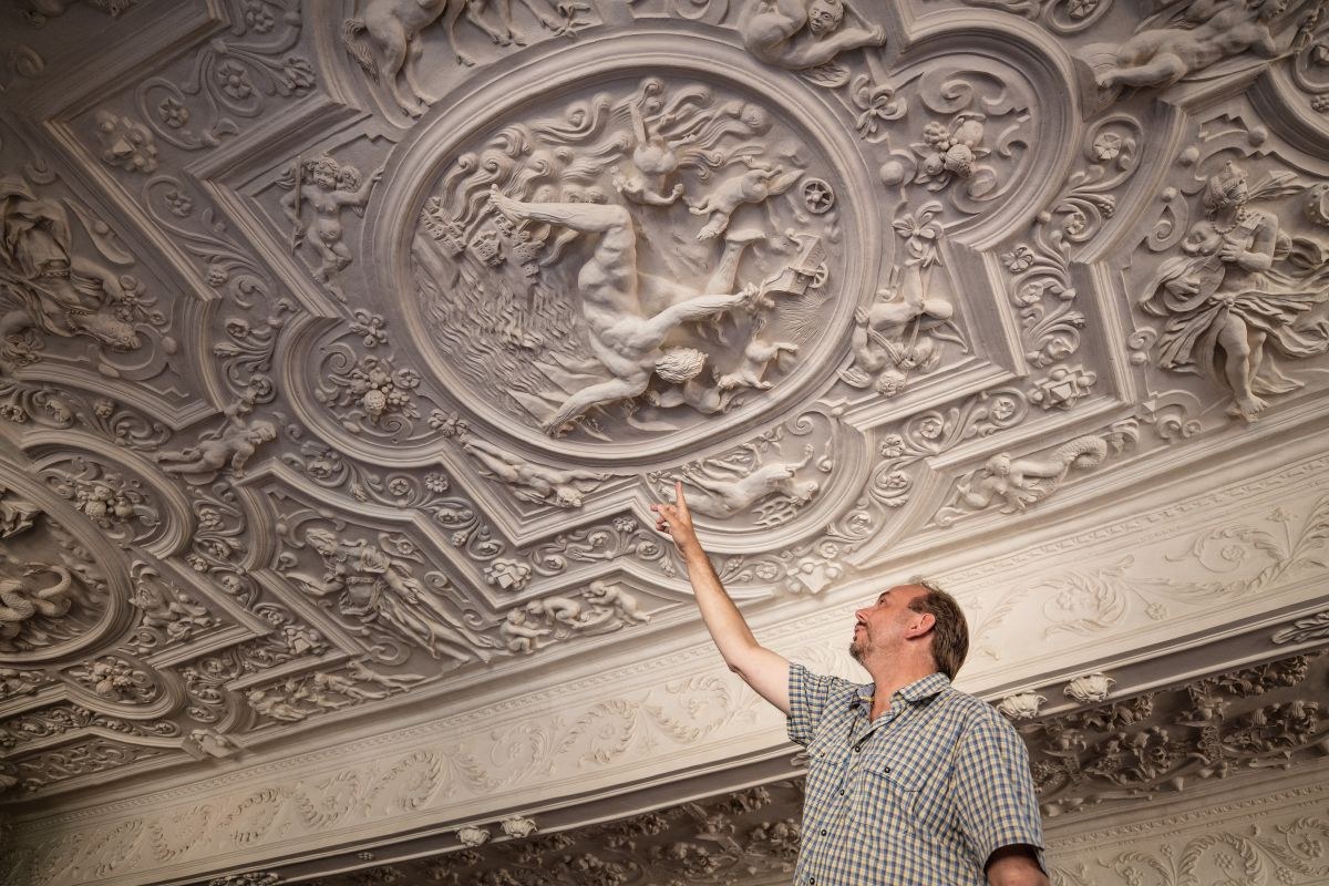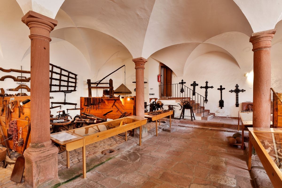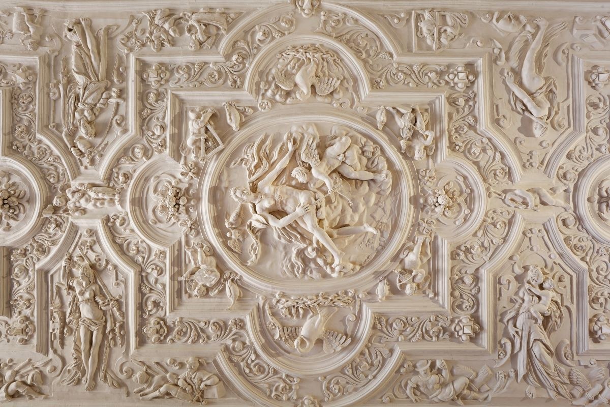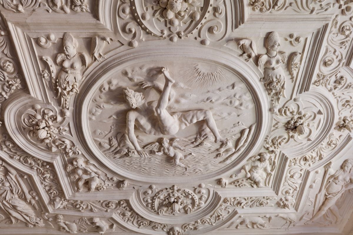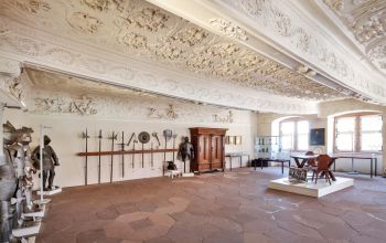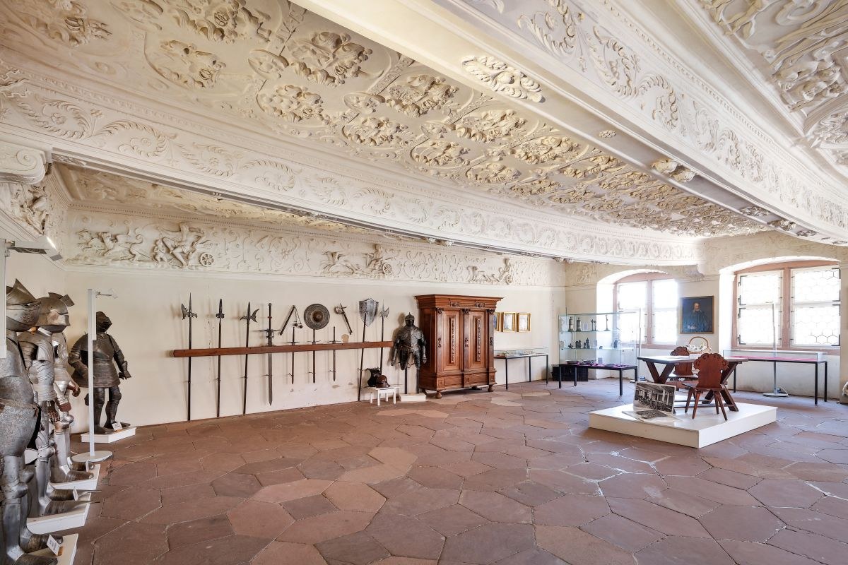 Der Marstall im Untergeschoss des Gebäudes diente ursprünglich als Pferdestall. Heute sind in dem Raum mit dem eindrucksvollen Gewölbe wertvolle Sandsteinarbeiten und altes Handwerk ausgestellt. Der darüber liegende Festsaal ist reich mit Bildern aus der antiken Mythologie ausstattet, die an vielen Stellen aus der Decke heraustreten und sehr plastisch wirken. Die wertvolle Stuckdecke zeigt einen Zug antiker Götter und Sagengestalten sowie die Wappen der Ahnen des Hausherrn. Die Stuckaturen zählen zu den bedeutendsten Arbeiten der Spätrenaissance und des Manierismus im süddeutschen Raum.