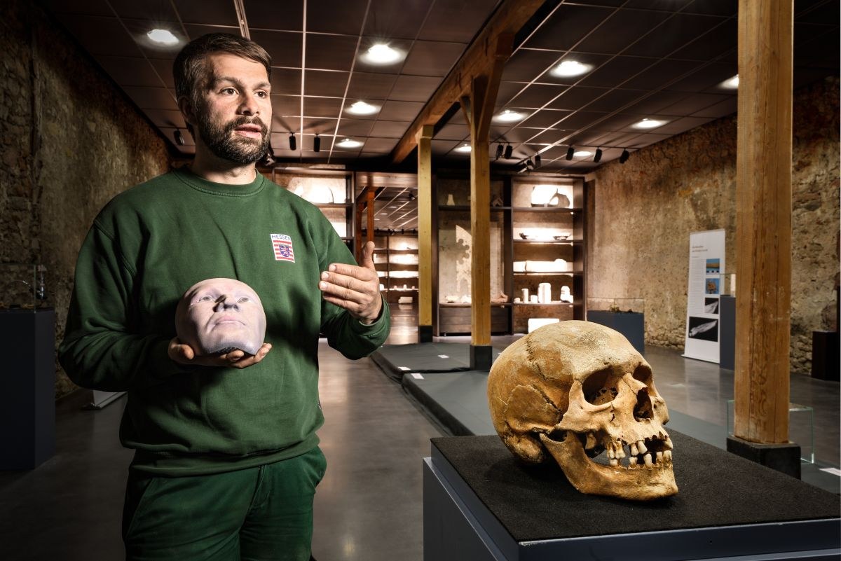 Wie kaum ein anderer Ort zeugt Lorsch von dem klösterlichen und weltlichen Leben, das zur Zeit Karls des Großen begann. Claus Kropp gibt Zeitzeugen ein Gesicht, um den Alltag der karolingischen Hochphase vor Augen zu führen – im wahrsten Sinne des Wortes: Er zeigt die 3D-Gesichtsrekonstruktion eines Mönches, die auf Basis eines bei Grabungen gefundenen Schädels erstellt wurde. Während Kropp erklärt, wie aus Knochen mithilfe modernster Analysemethoden Rückschlüsse auf Aussehen, Gesundheitszustand und Lebensweise gewonnen werden, tritt er an einen Projektionstisch, der ein auf dem Klostergelände gefundenes Skelett zeigt. „Bei dem Benediktiner handelt es sich um einen typischen Schreibtischtäter“, erklärt der Archäologe zu dem Knochenfund. „Seine biologische Biografie passt in unser Bild über das klösterliche Leben, welche uns über die Benediktsregel und andere Quellen überliefert ist.“ So litt der Mönch mutmaßlich an Übergewicht, Arthrose und Rückenschmerzen, als er im Alter von circa 40 Jahren starb.