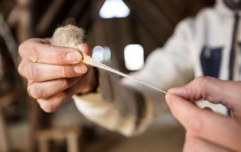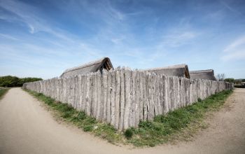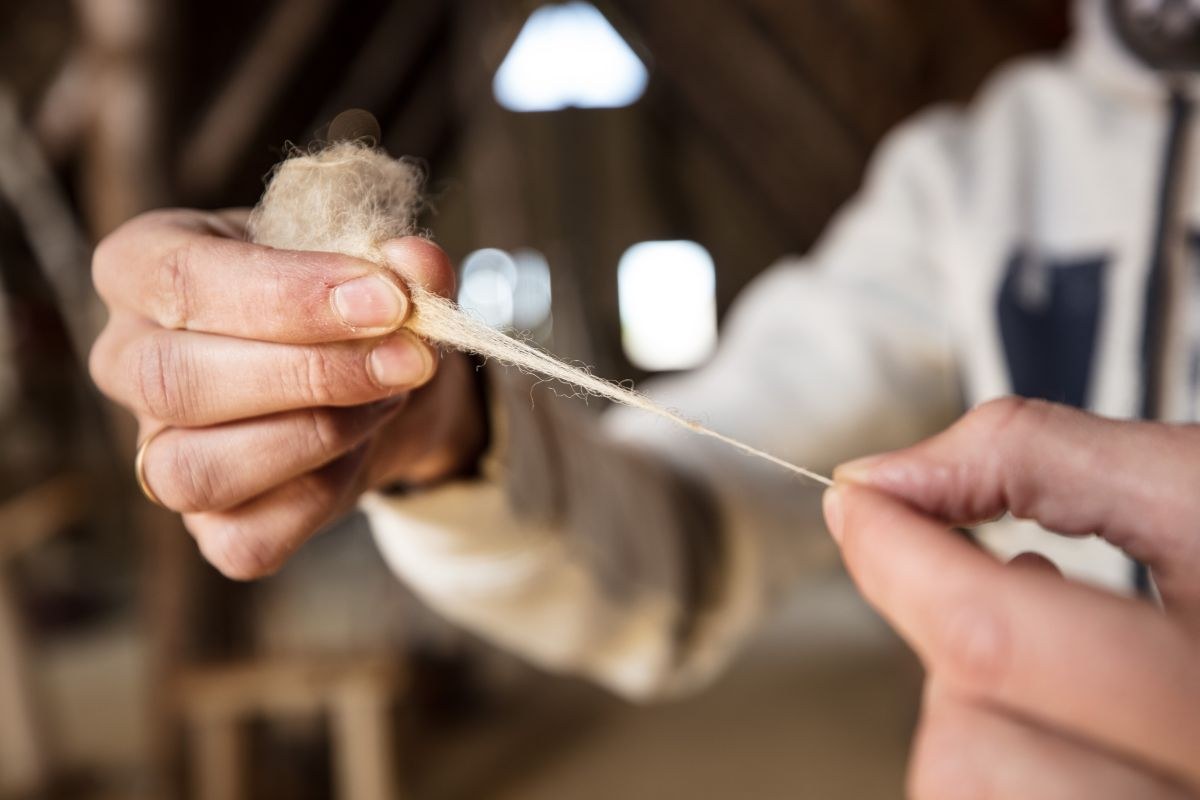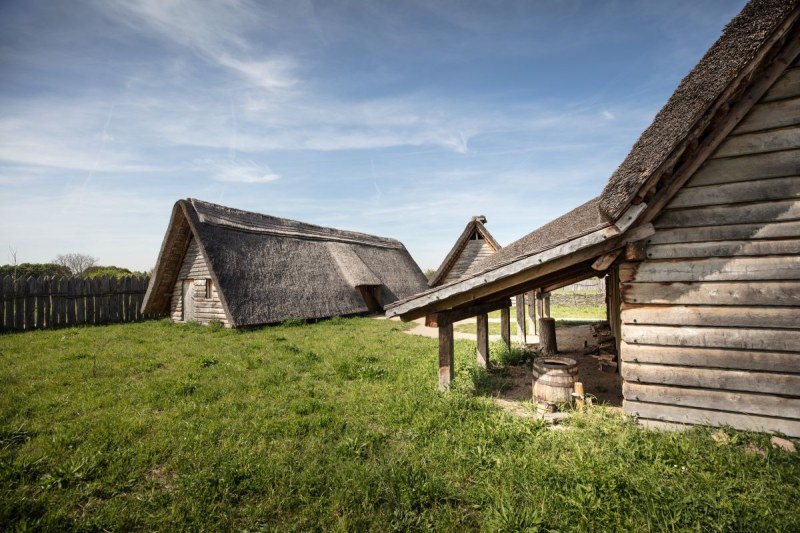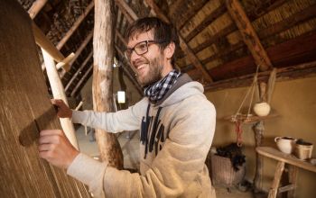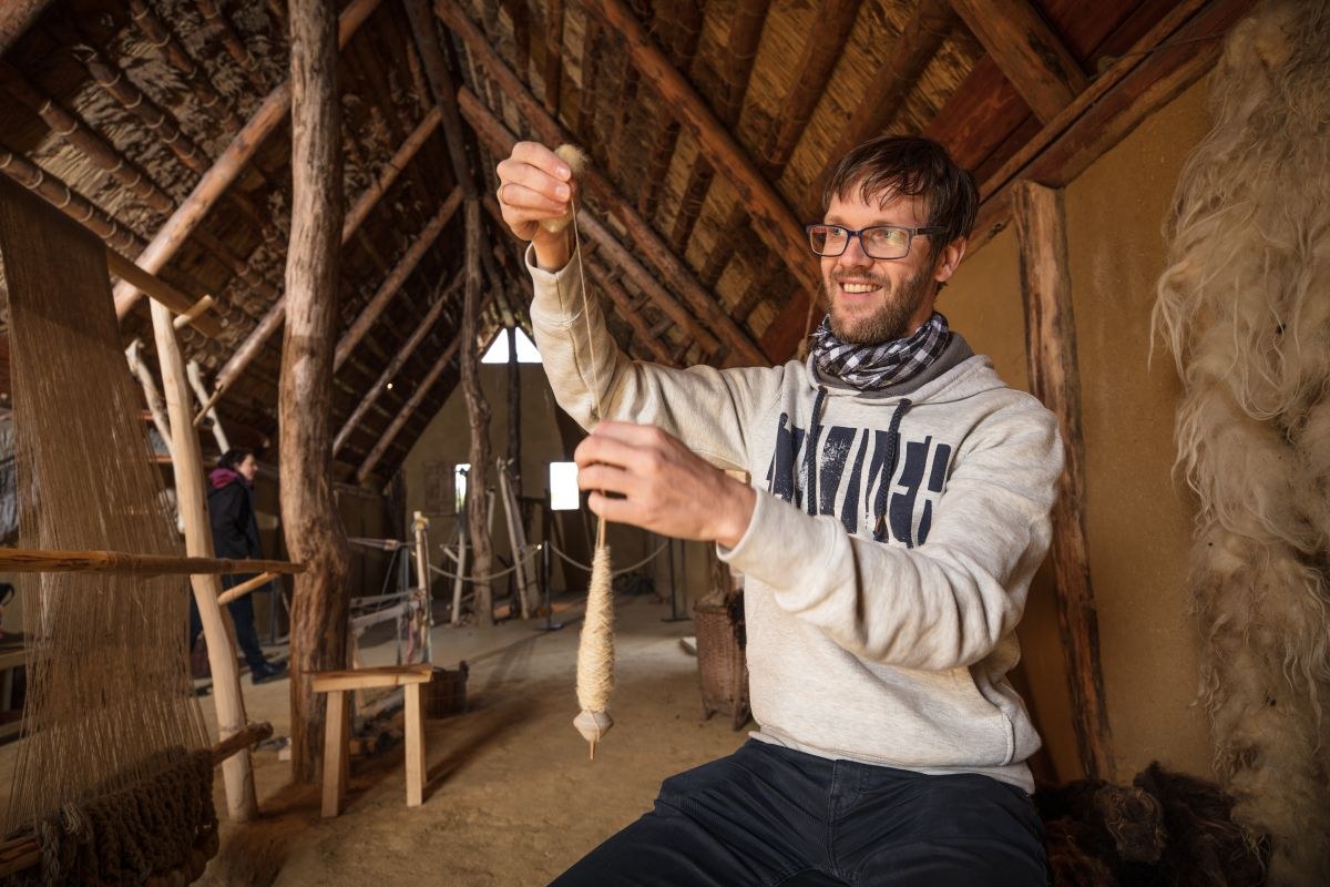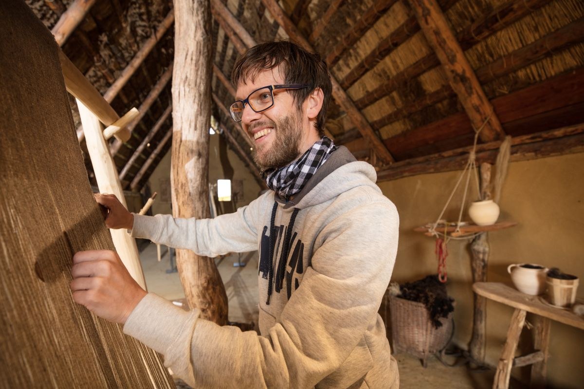 Zu den wichtigsten Handwerkskünsten zählte das Weben. „Die Menschheit webt schon sehr lange. Dabei kamen Geräte zum Einsatz, von denen wir heute nicht mehr alle im Detail kennen“, erklärt Florian Saum, der sich in Lauresham mit der Arbeit am Gewichtswebstuhl beschäftigt. „Weben hat mich schon immer fasziniert“, berichtet er. Von den Webstühlen aus der Karolingerzeit finden Archäologen zwar noch die Gewichte, welche die Kettfäden straff nach unten halten. Der hölzerne Aufbau ist jedoch nicht mehr erhalten. Als Zeugen der von Frauen in einem Webhaus betriebenen Kunst haben Stoffreste die Jahrhunderte überdauert. „Diese Funde reichen von ganz feinen bis zu groben Woll- oder Leinenstoffen“, erzählt Saum, während er selbst das Schiffchen durch recht dicke, senkrecht auf den Webstuhl aufgespannte Wollfäden schickt. „Sie lassen erahnen, wie damals gearbeitet wurde. Manchmal frage er sich, wie die Frauen seine Arbeit wohl beurteilen würden. An dem Webstuhl entsteht gerade eine vier Meter lange Stoffbahn, die anschließend ausgerüstet wird. Saum: „Man kann den Stoff walken oder die Fasern mittels Distelkarden aufrauen. Ziel ist es, einen festen, strapazierfähigen Stoff zu bekommen.“ Ein weiteres Feld des Experimentierens für die Weber von Lauresham.